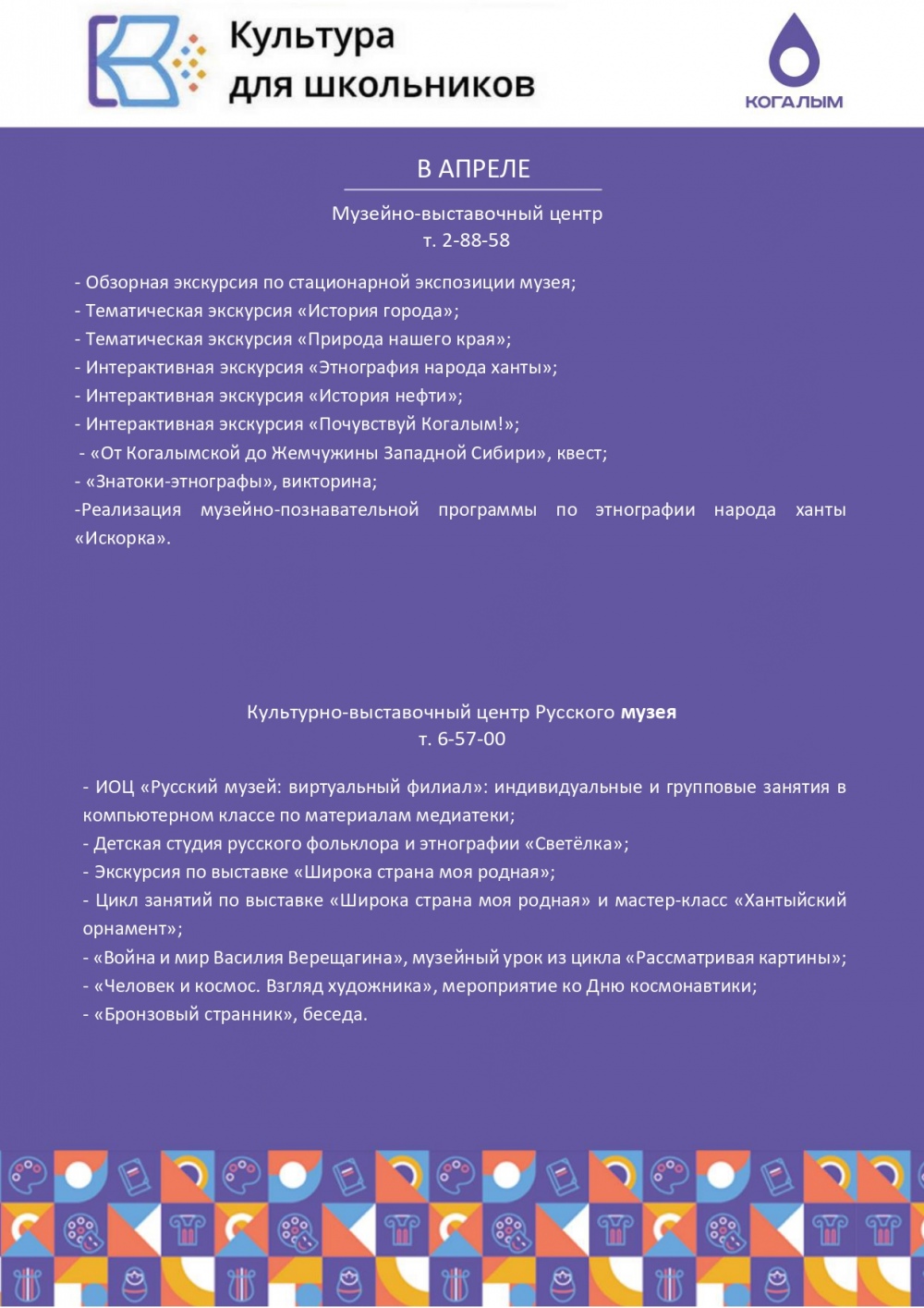 В городе Когалыме в проекте "Культура для школьников" участвует Музейно-выставочный центр и Культурно-выставочный центр Русского музея. Мероприятия указаны на афише.