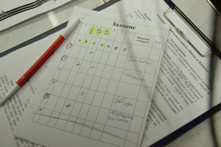 Участникам мероприятия было предложено поделиться на команды и пройти нелегкие испытания по заранее полученному маршруту. Ребят ждал импровизированный проход через горное ущелье, небольшая полоса препятствий, воссоздание в реальной жизни фотографий времен Великой Отечественной войны, рисование плаката на тему битвы за Кавказ и тематические кроссворды, ребусы и шарады.