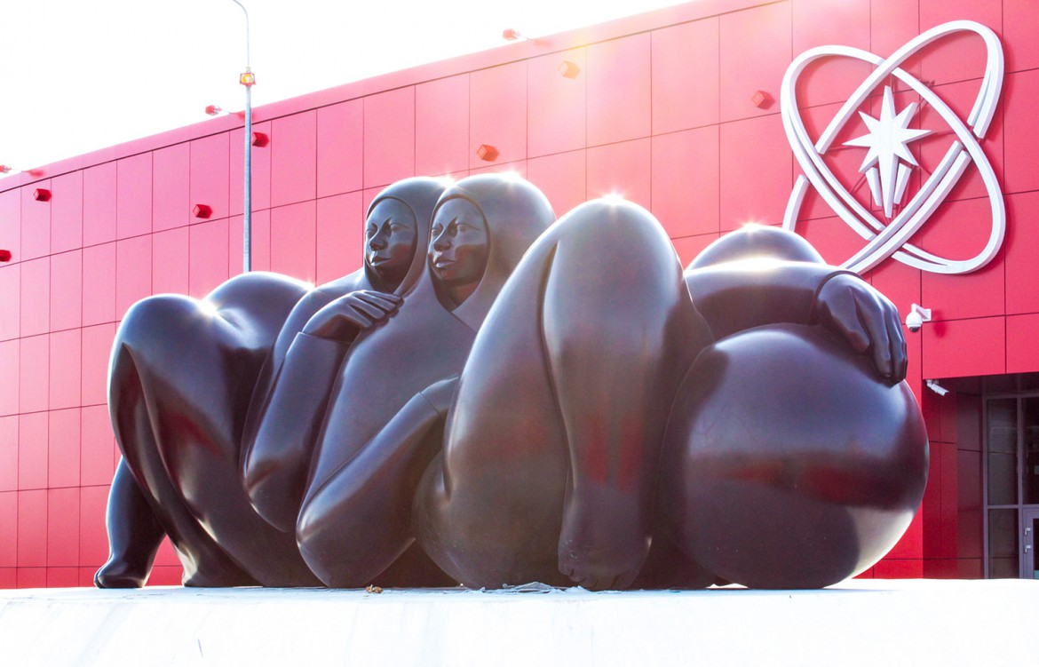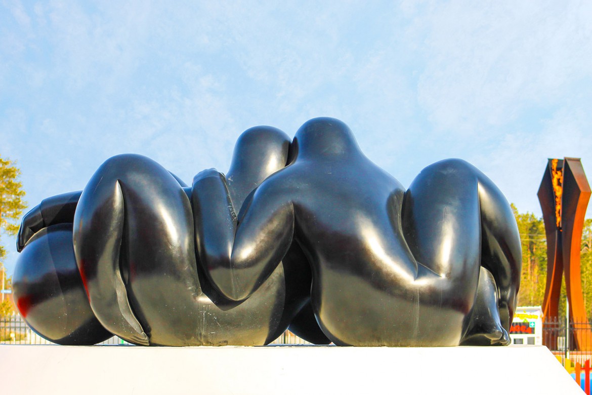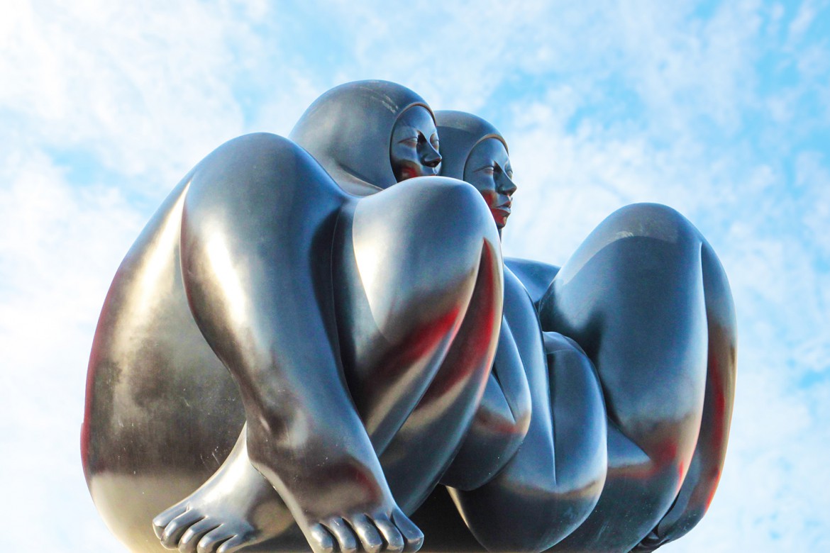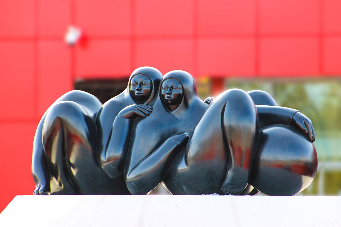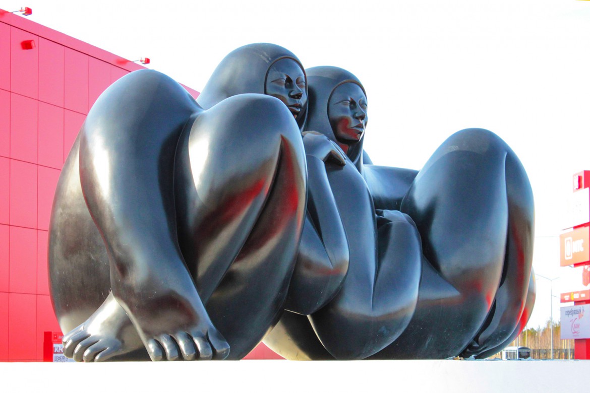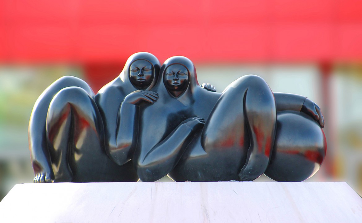 Автор Заключенные в бронзу с черной патиной две женщины символизируют счастье и бесконечность.
