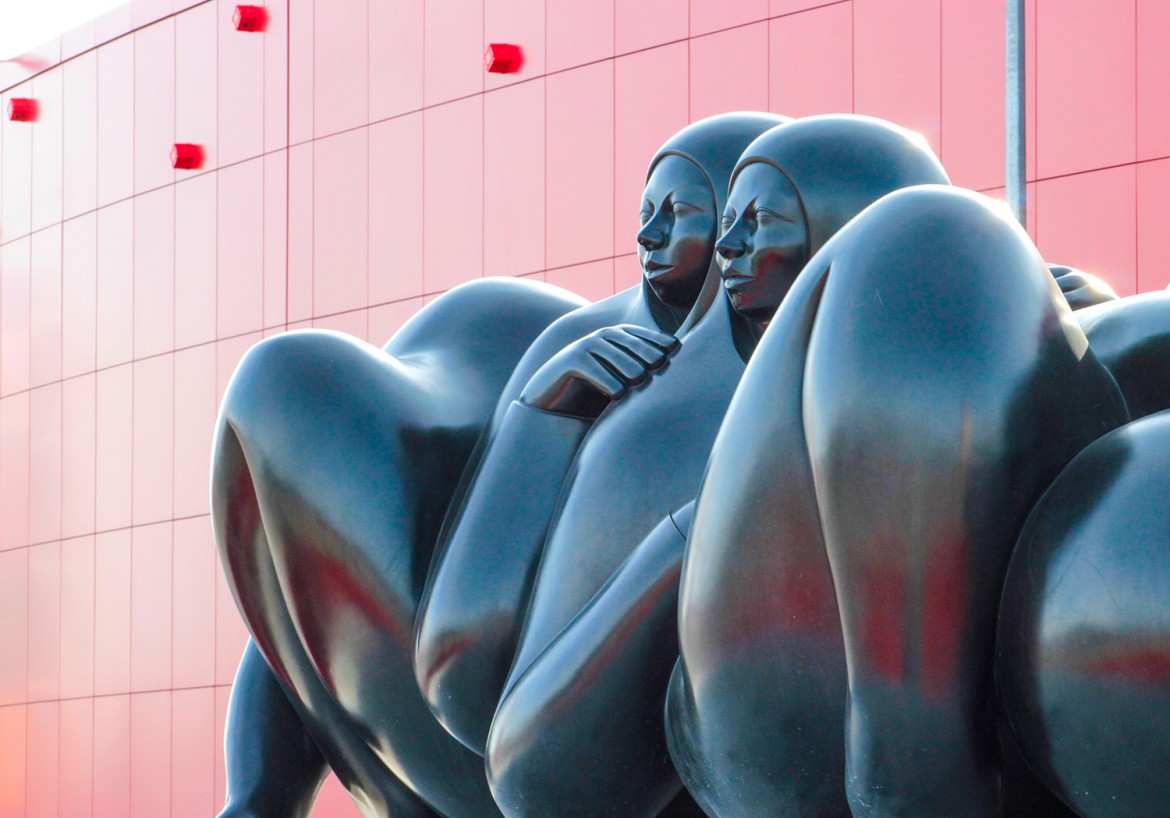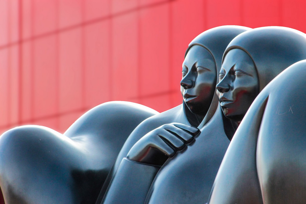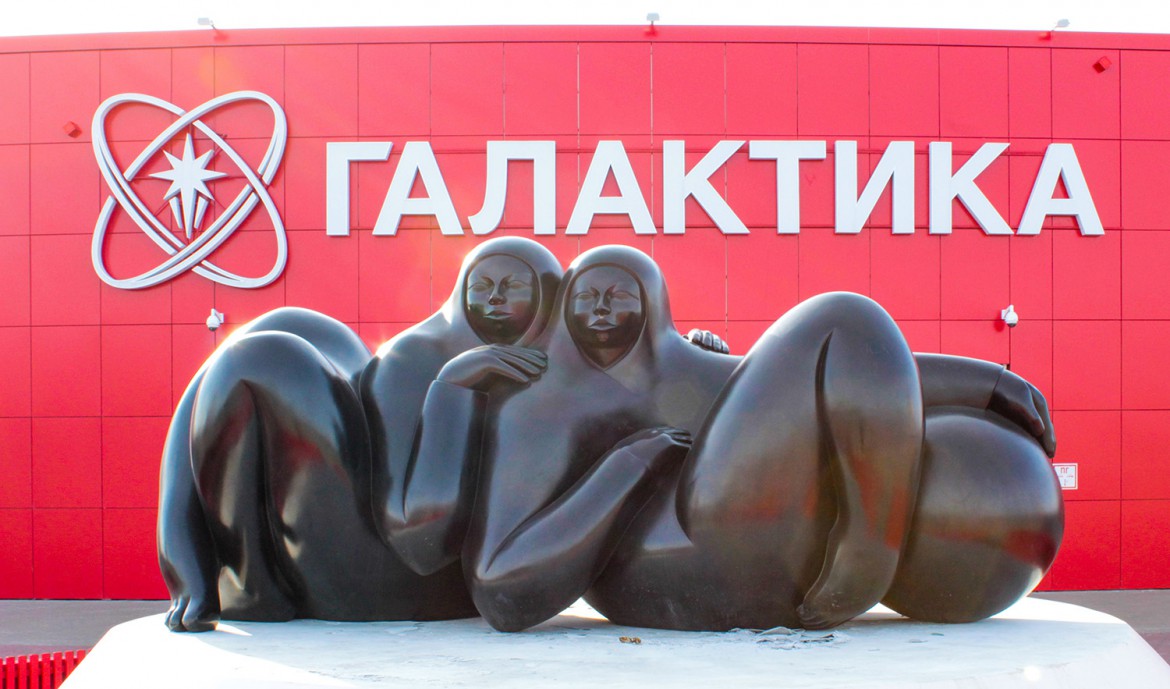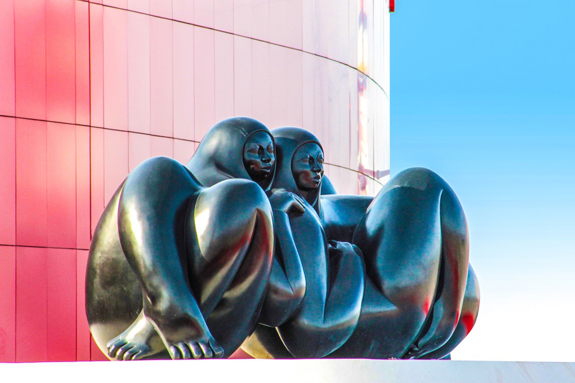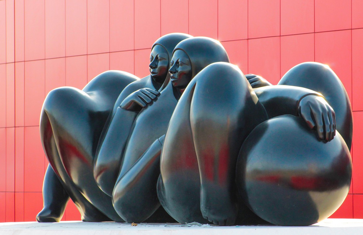 Автор Заключенные в бронзу с черной патиной две женщины символизируют счастье и бесконечность.