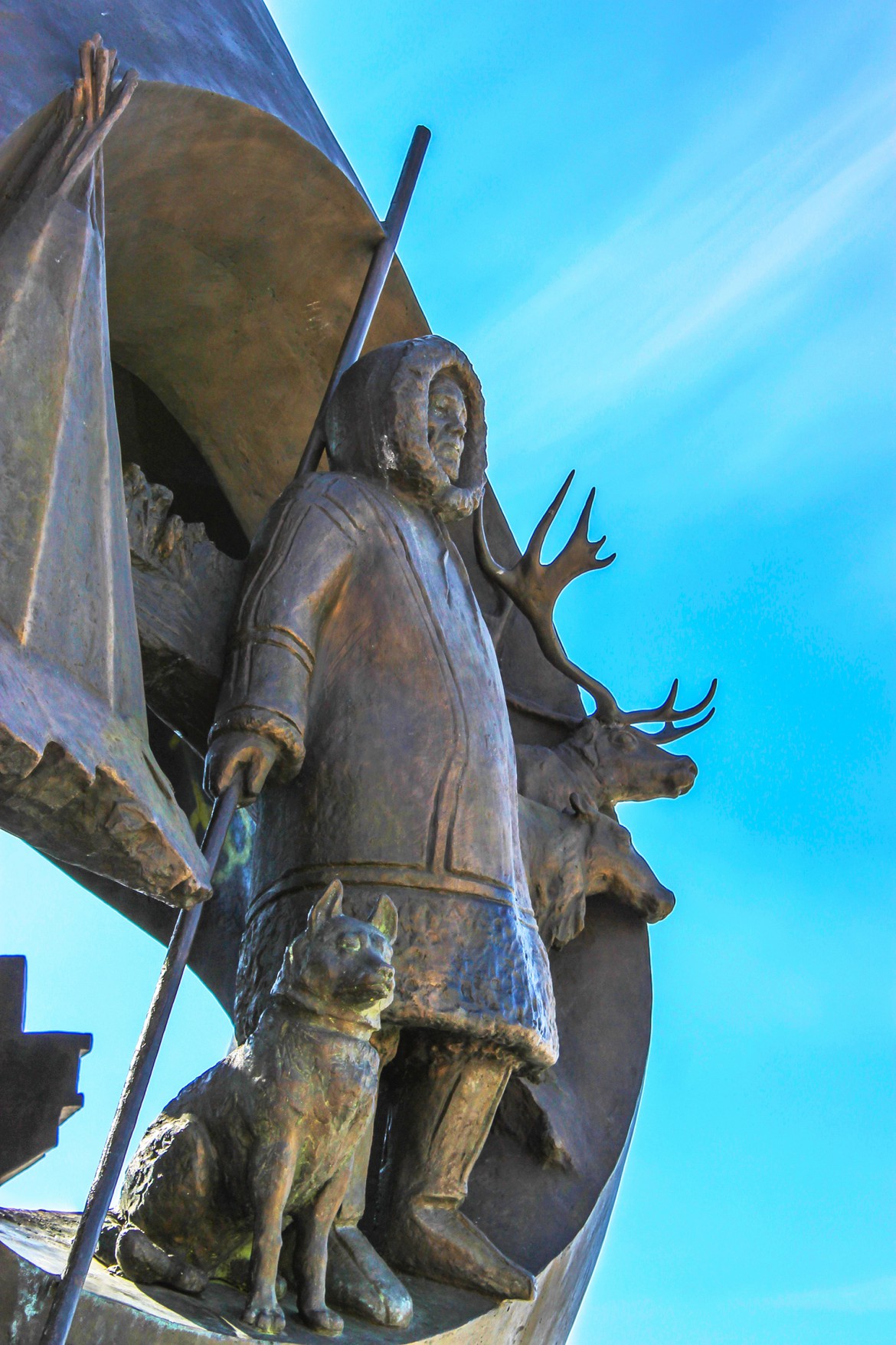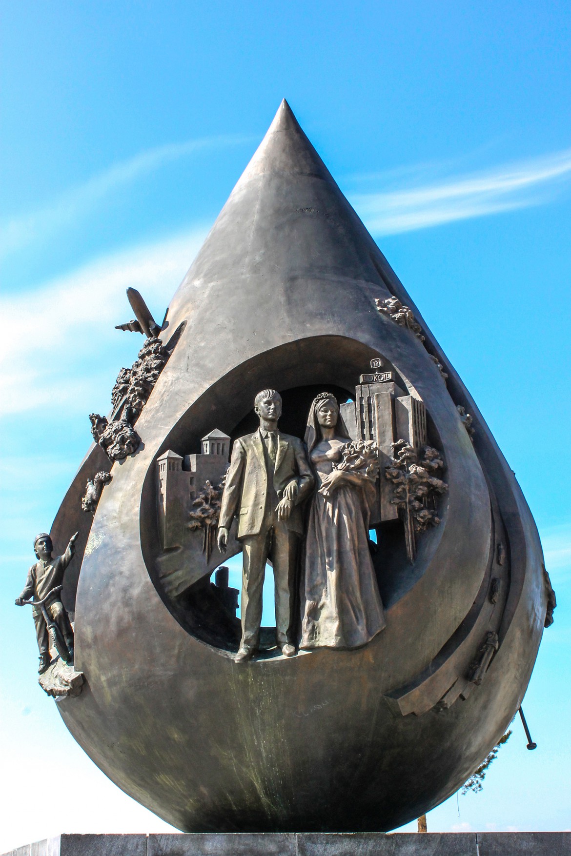 Общая высота скульптурной композиции 8,5 м. На стилизованных гранях нефтяной капли представлены сюжеты из жизни таежного города - молодожены на пороге ЗАГСа, коренное население, северный народ, ханты, счастливые дети, нефтяная промышленность, природа.