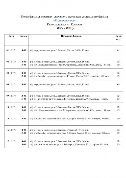 В программе фестиваля предусмотрен бесплатный показ социальных фильмов в 85 кинозалах автономного округа. В городе Когалыме бесплатные кинопоказы фестиваля состоятся с 1 по 17 декабря 2017 года.