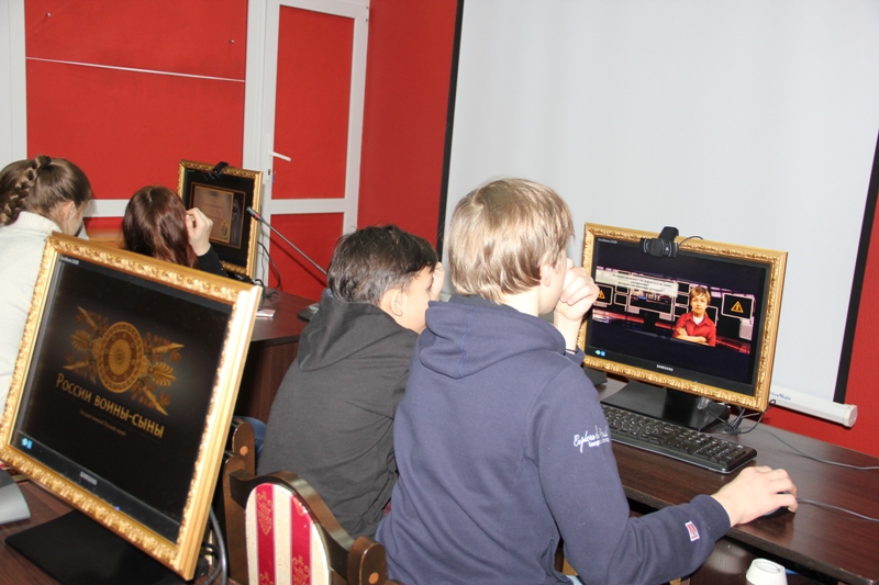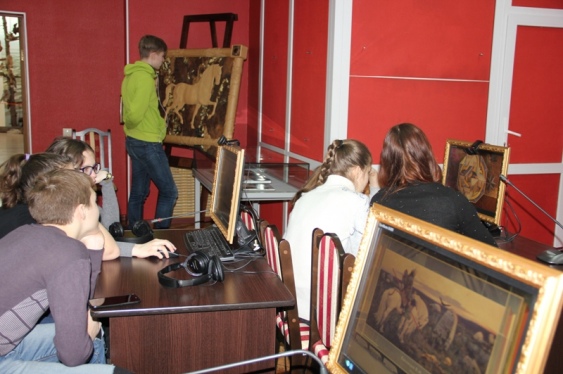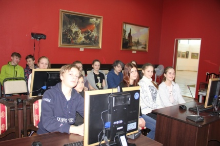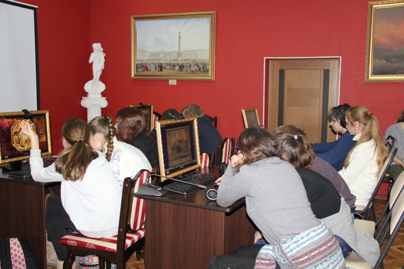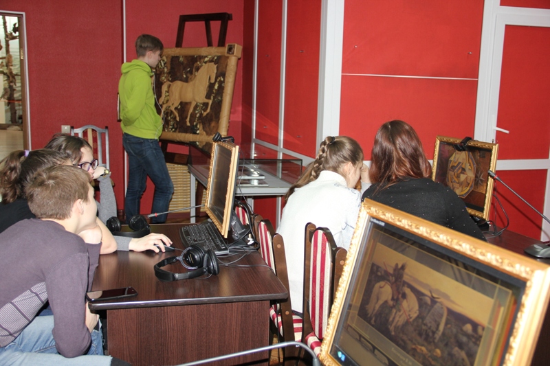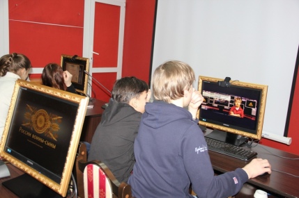 Затем, московские гимназисты посетили информационно-образовательный центр «Русский музей: виртуальный филиал». Юному поколению было интересно окунуться в атмосферу изобразительного искусства и познакомиться с возможностями виртуального филиала. Юные гости нашего города смогли увидеть и воспользоваться возможностями медиатеки нашего информационно-образовательного центра. Камерная обстановка виртуального филиала Русского музея расположила к дружескому общению. Московские ребята помогали друг другу преодолевать ступени многоуровневой игровой программы «Воины-сыны» и с успехом завершили этот процесс полным выполнением всех заданий. Победа в этом игровом процессе завершилась исполнением народных песен и подарила замечательное настроение не только исполнителям, но и сотрудникам музея.