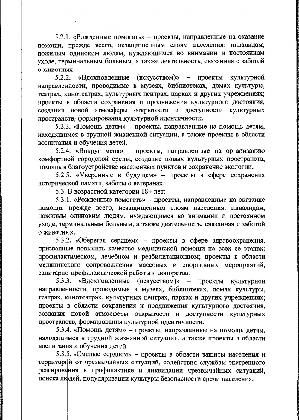 - «Рождённые помогать» - проекты, направленные на оказание помощи, прежде всего, незащищённым слоям населения: инвалидам, пожилым и одиноким людям, нуждающимся во внимании и постоянном уходе; деятельность, связанная с заботой о животных;