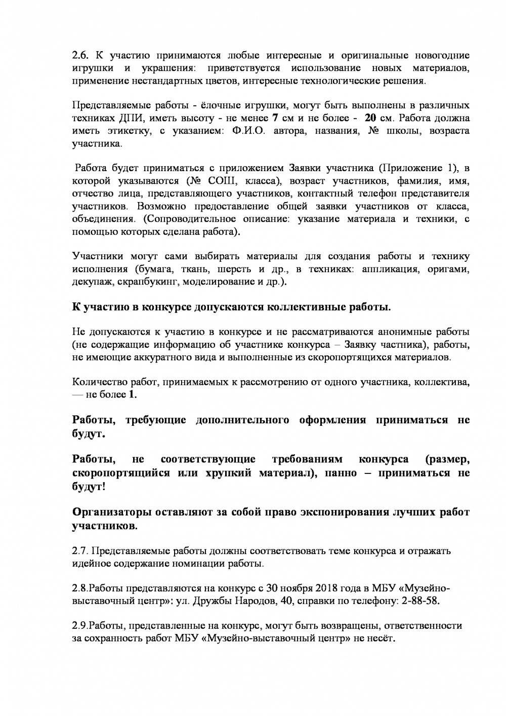 Представляемые работы - ёлочные игрушки, могут быть выполнены в различных техниках ДПИ, иметь высоту - не менее 7 см и не более - 20 см. Работа должна иметь этикетку, с указанием: Ф.И.О. автора, названия, № школы, возраста участника.