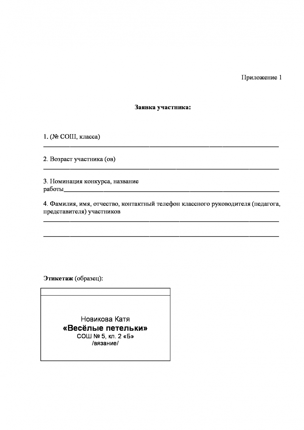 Работа будет приниматься с приложением Заявки участника (Приложение 1), в которой указываются (№ СОШ, класса), возраст участников, фамилия, имя, отчество лица, представляющего участников, контактный телефон представителя участников. Возможно предоставление общей заявки участников от класса, объединения. (Сопроводительное описание: указание материала и техники, с помощью которых сделана работа).