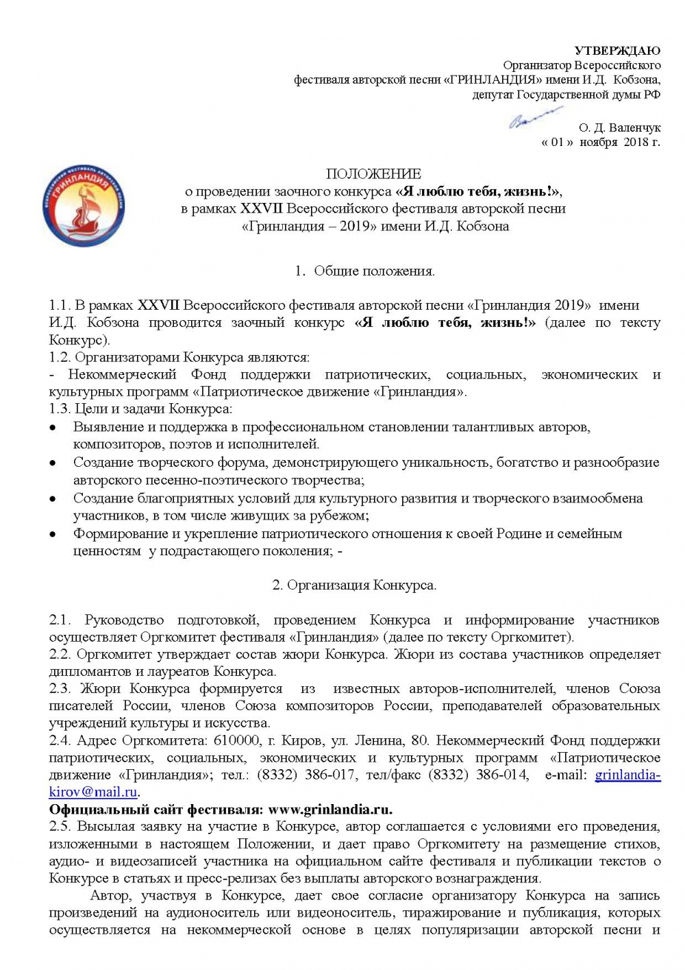 Заочный конкурс «Я люблю тебя, жизнь», проводимый в рамках Всероссийского фестиваля авторской песни «Гринландия» им. И.Д. Кобзона