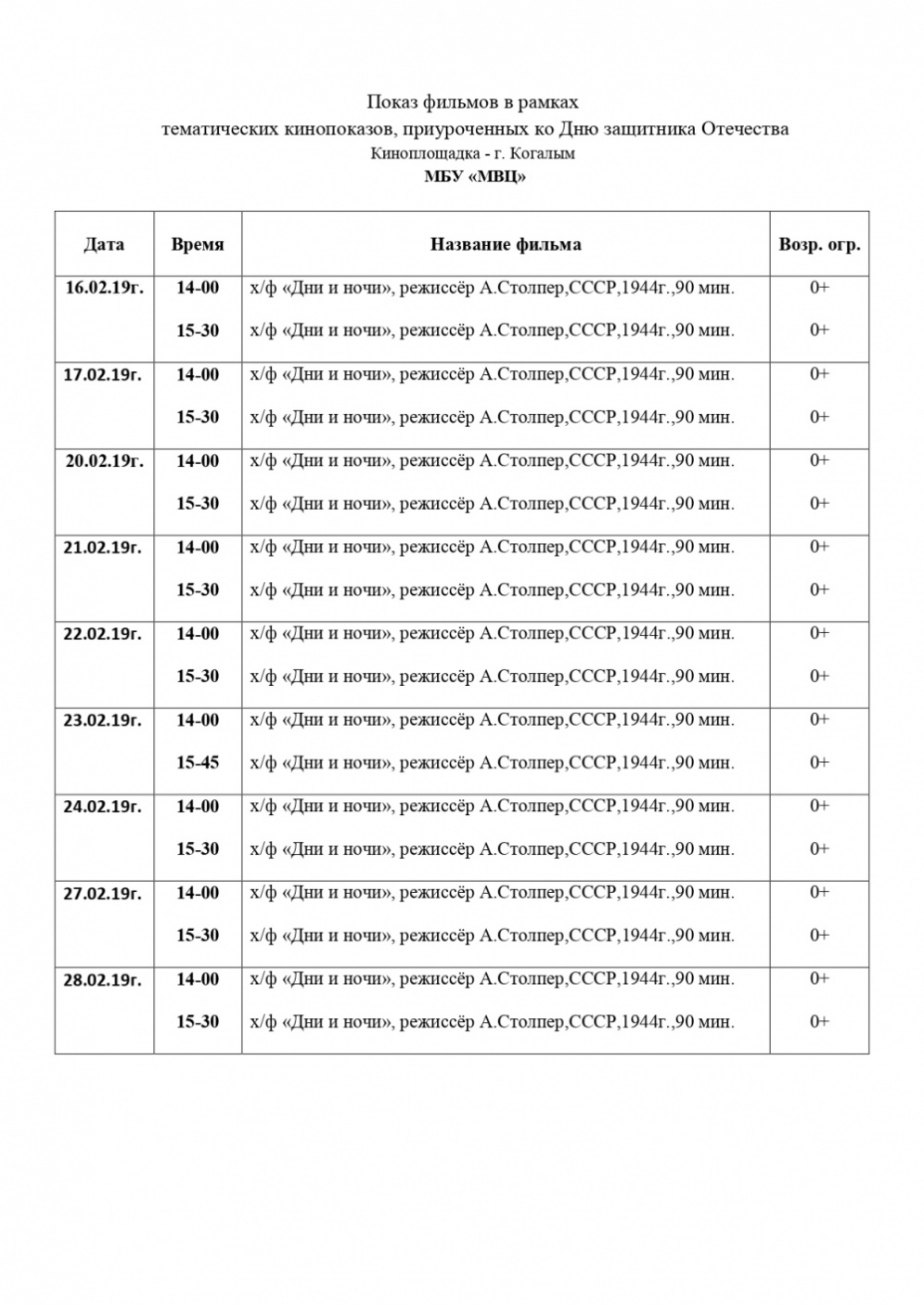Киноплощадка музейно-выставочного центра ждет гостей с 16.02.2019 по 28.02.2019.