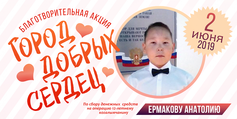 Музейно-выставочный центр приглашает 2 июня 2019 года на благотворительную акцию «Город добрых сердец» по сбору денежных средств на операцию 12-летнему когалымчанину Ермакову Анатолию.