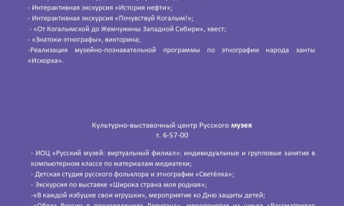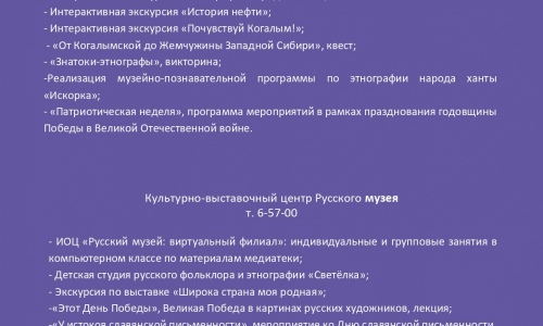 В городе Когалыме в проекте "Культура для школьников" участвует Музейно-выставочный центр и Культурно-выставочный центр Русского музея. Мероприятия указаны на афише.