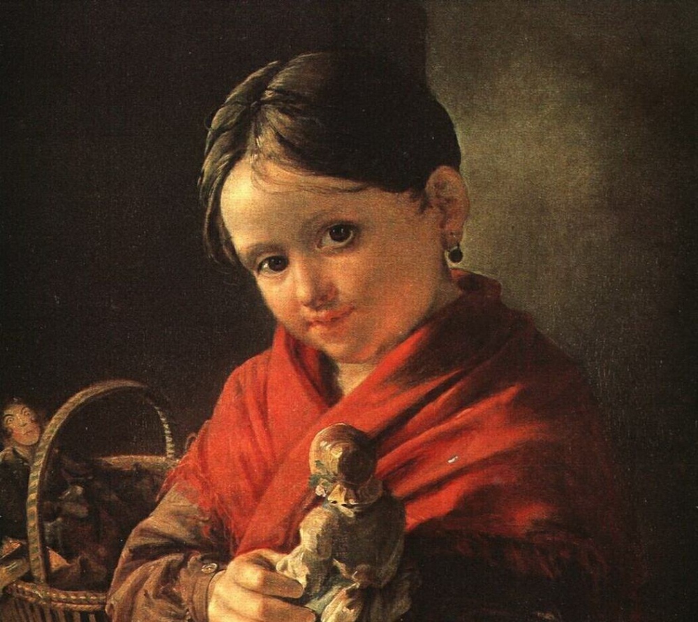 Теплотой и душевностью веет от «Девочки с куклой», написанной Тропининым в 1841 г. Ребёнок наслаждается моментом игры с куклой, радость девочки негромкая и очень искренняя, что отражается и в позе, обнимающем игрушку жесте рук, мягком и открытом взгляде, лёгкой полуулыбке.