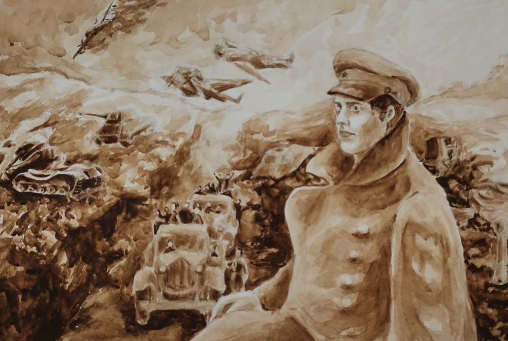 И сегодня мы с вами можем вспомнить легендарную личность - образ героя войны представлен в картине Романенко Алены «Портрет генерал-майора М.В. Захарова». Эта работа выполнена в технике монохромной акварели. (Монохромное изображение состоит из одного цвета, или его оттенков). Термин монохромный происходит от древнегреческих слов - "один" и "цвет".