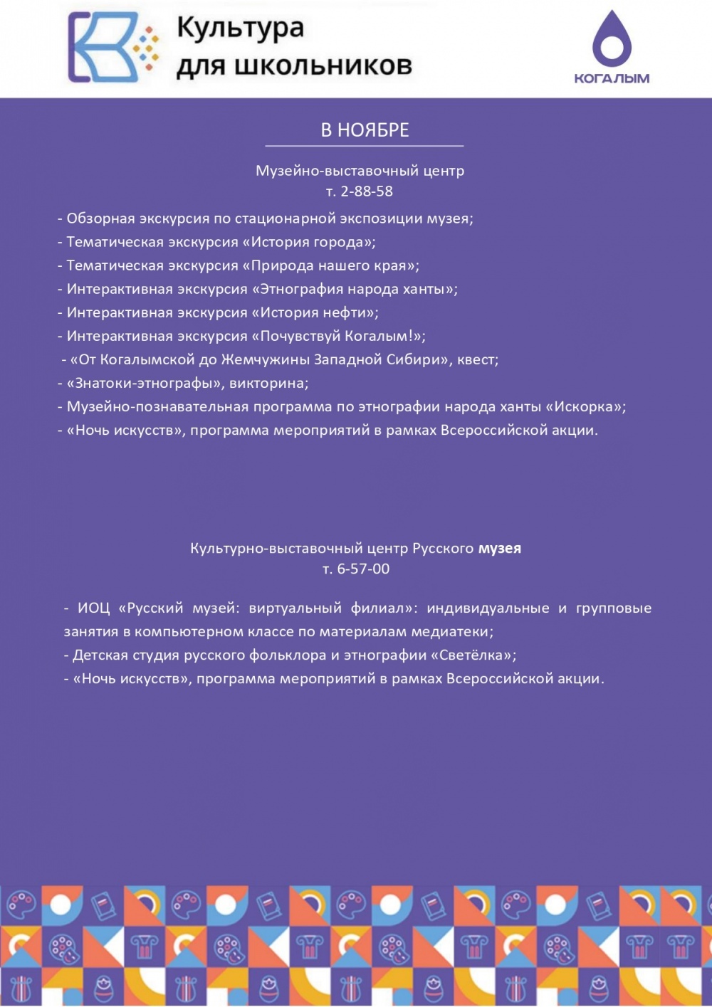 В городе Когалыме в проекте "Культура для школьников" участвует Музейно-выставочный центр и Культурно-выставочный центр Русского музея. Мероприятия указаны на афише.