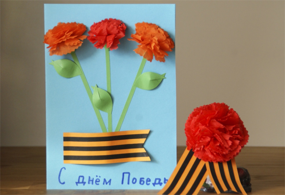 Сделать самому замечательную открытку, используя бумажные гвоздики и «георгиевскую» ленточку достаточно просто. Но выглядит такая открытка очень празднично и торжественно.