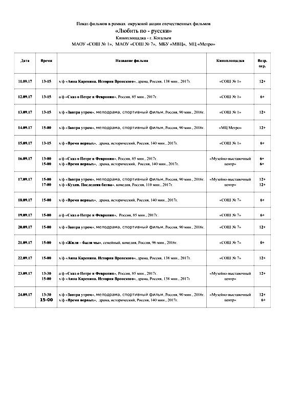 Киноплощадка - г. Когалым МАОУ «СОШ № 1», МАОУ «СОШ № 7», МБУ «МВЦ», МЦ «Метро». Вход свободный.