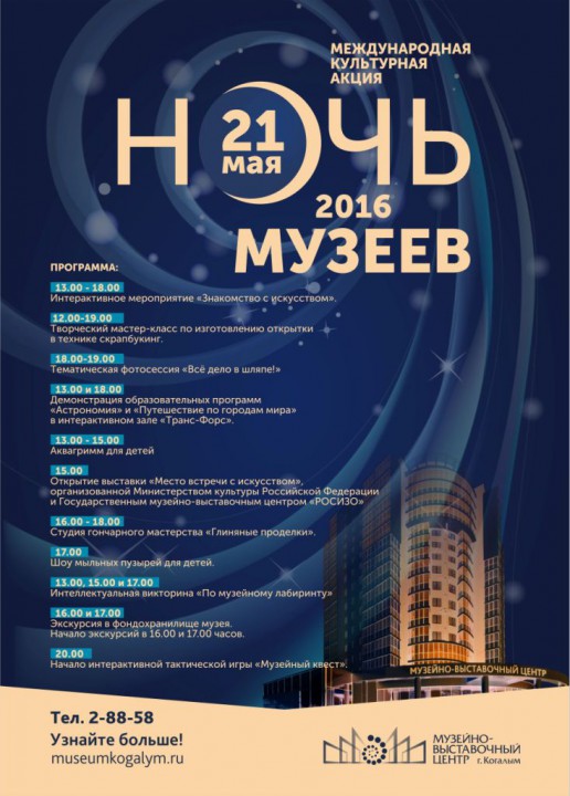 Программа проведения акции «Ночь музеев 2016» в Муниципальном бюджетном учреждении «Музейно-выставочный центр» 21 мая 2016 года