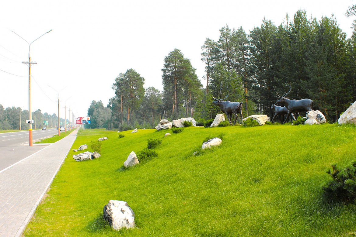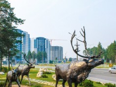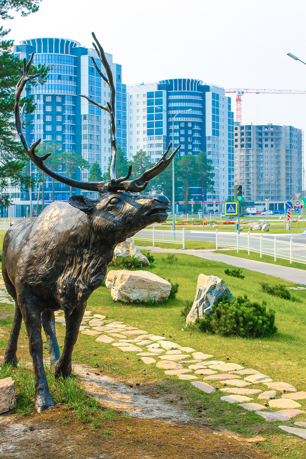 Скульптурная композиция состоит из 4-х скульптур оленей, встроенных в следующем порядке: олень-самец с крупными рогами, олененок крупный, самка с рогами, олененок маленький. Скульптурная композиция «Навстречу солнцу» - это дар городу Когалыму в честь 30-летия от группы предприятий ПАО «ЛУКОЙЛ» в Пермском крае.
