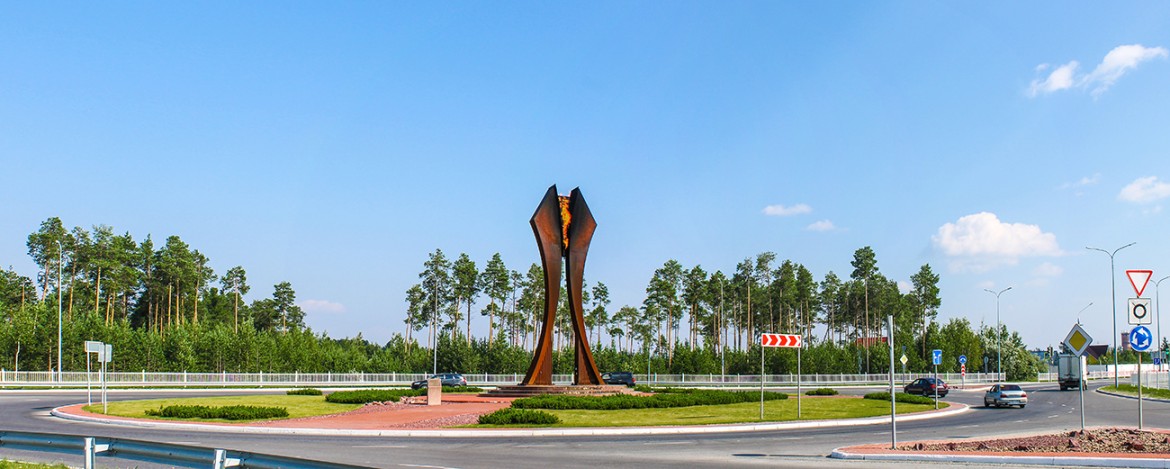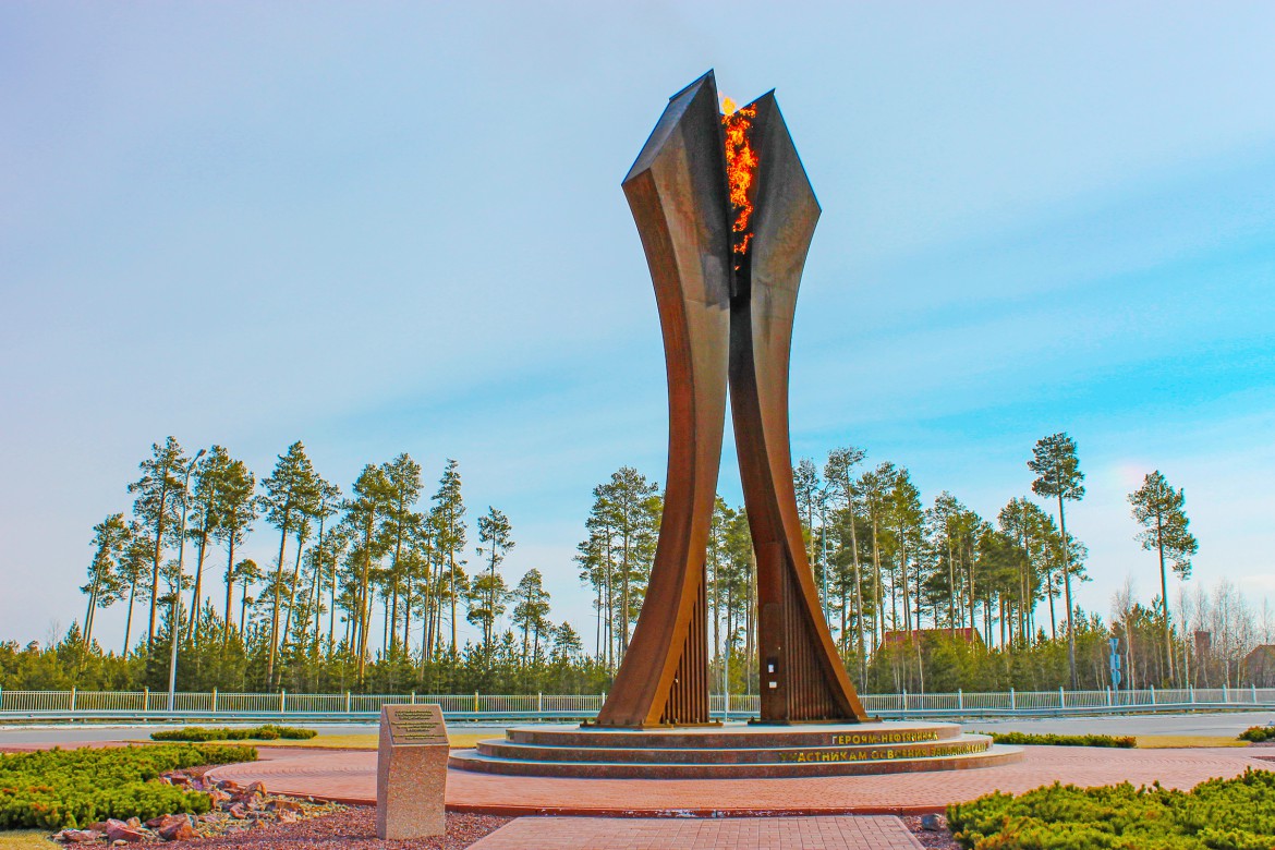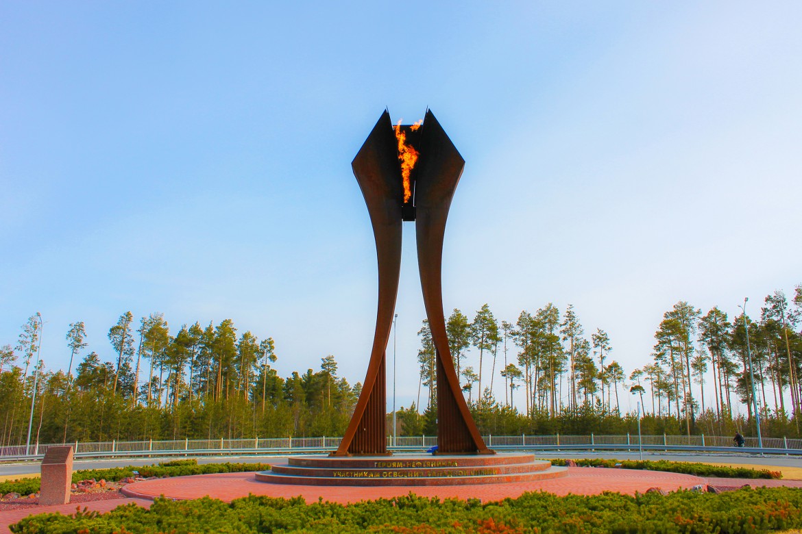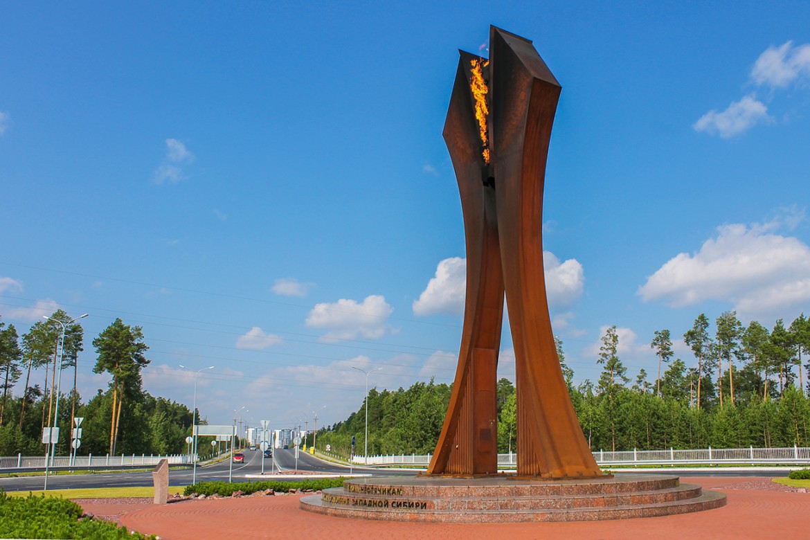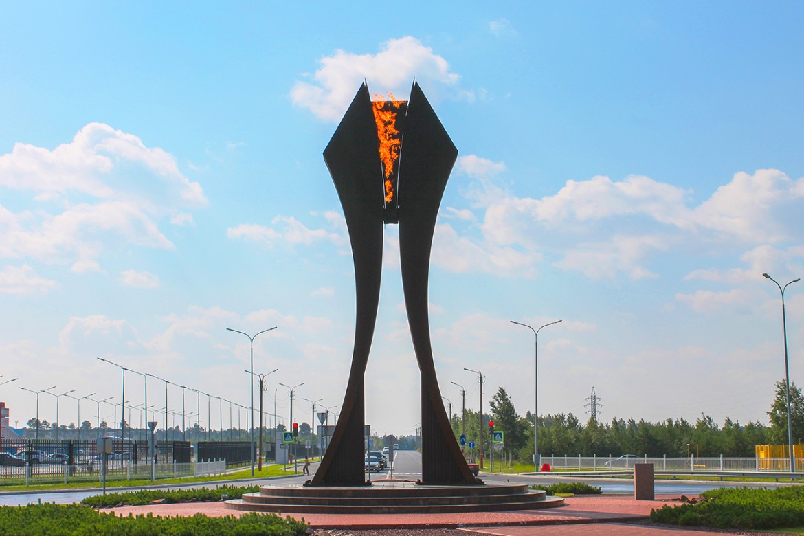 Подарок жителям Когалыма. Памятник выполнен в современном стиле в виде металлической инсталляции - двух стремящихся вверх параллелей, объеденных в центре горящим факелом, олицетворяющим значимость нефтегазовой отрасли для человечества.