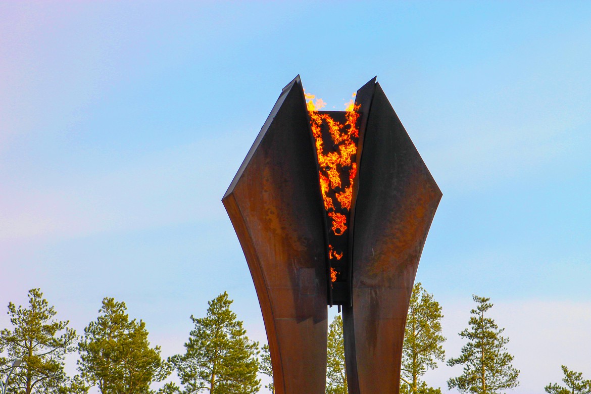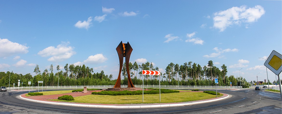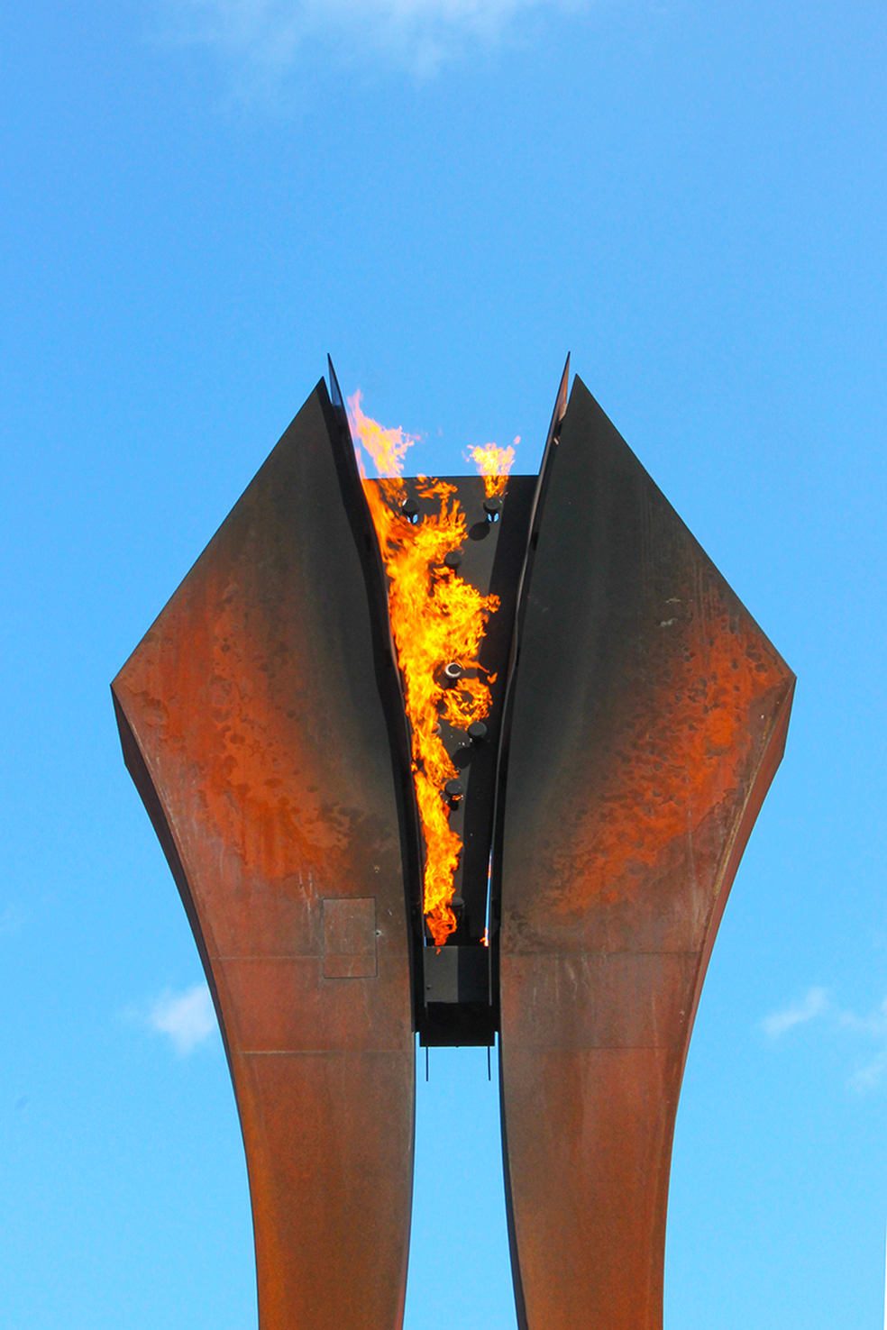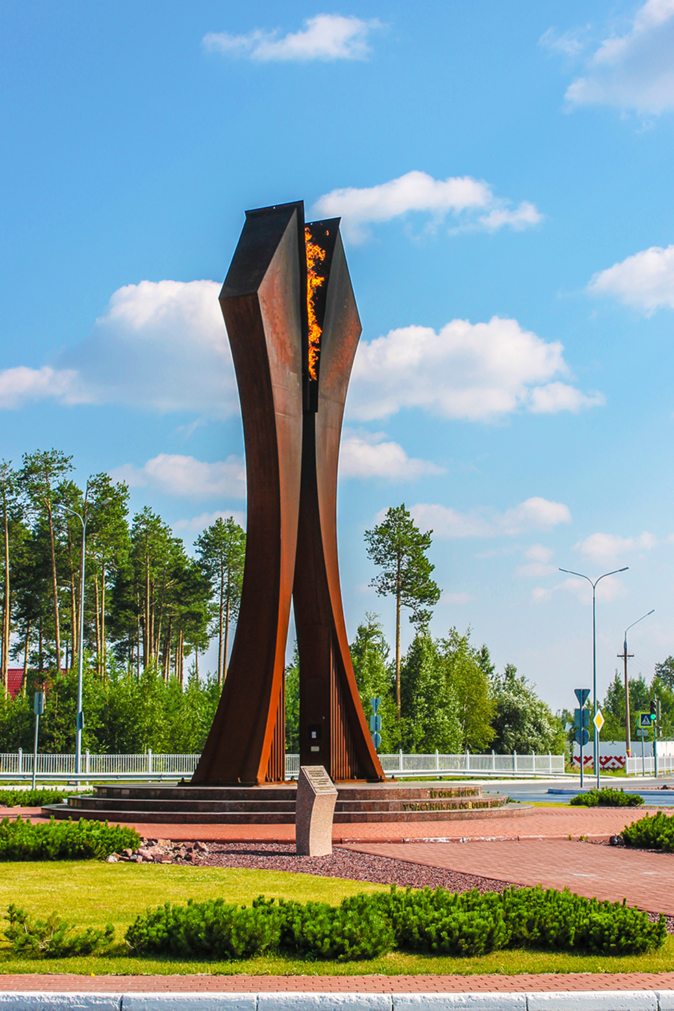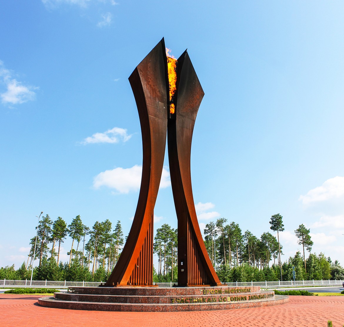 Подарок жителям Когалыма. Памятник выполнен в современном стиле в виде металлической инсталляции - двух стремящихся вверх параллелей, объеденных в центре горящим факелом, олицетворяющим значимость нефтегазовой отрасли для человечества.