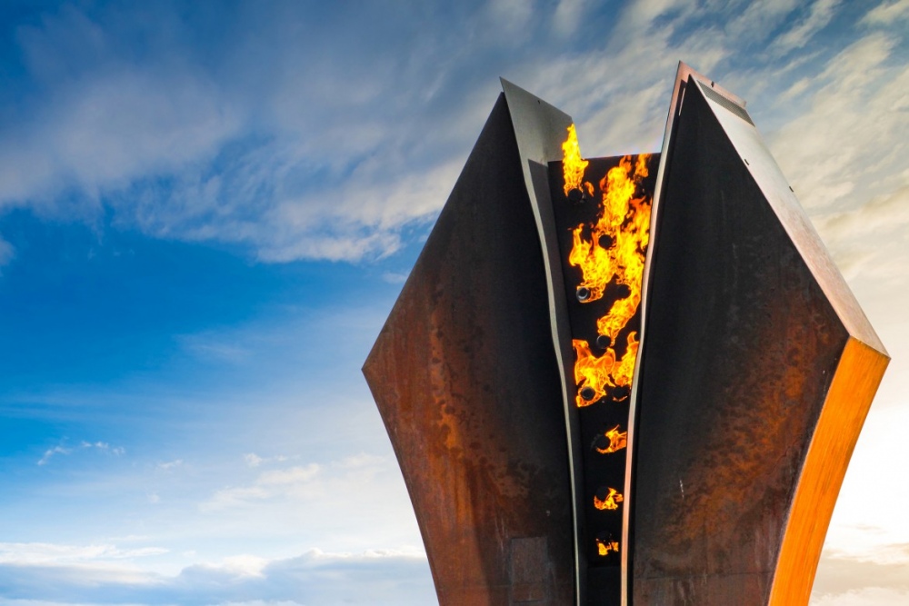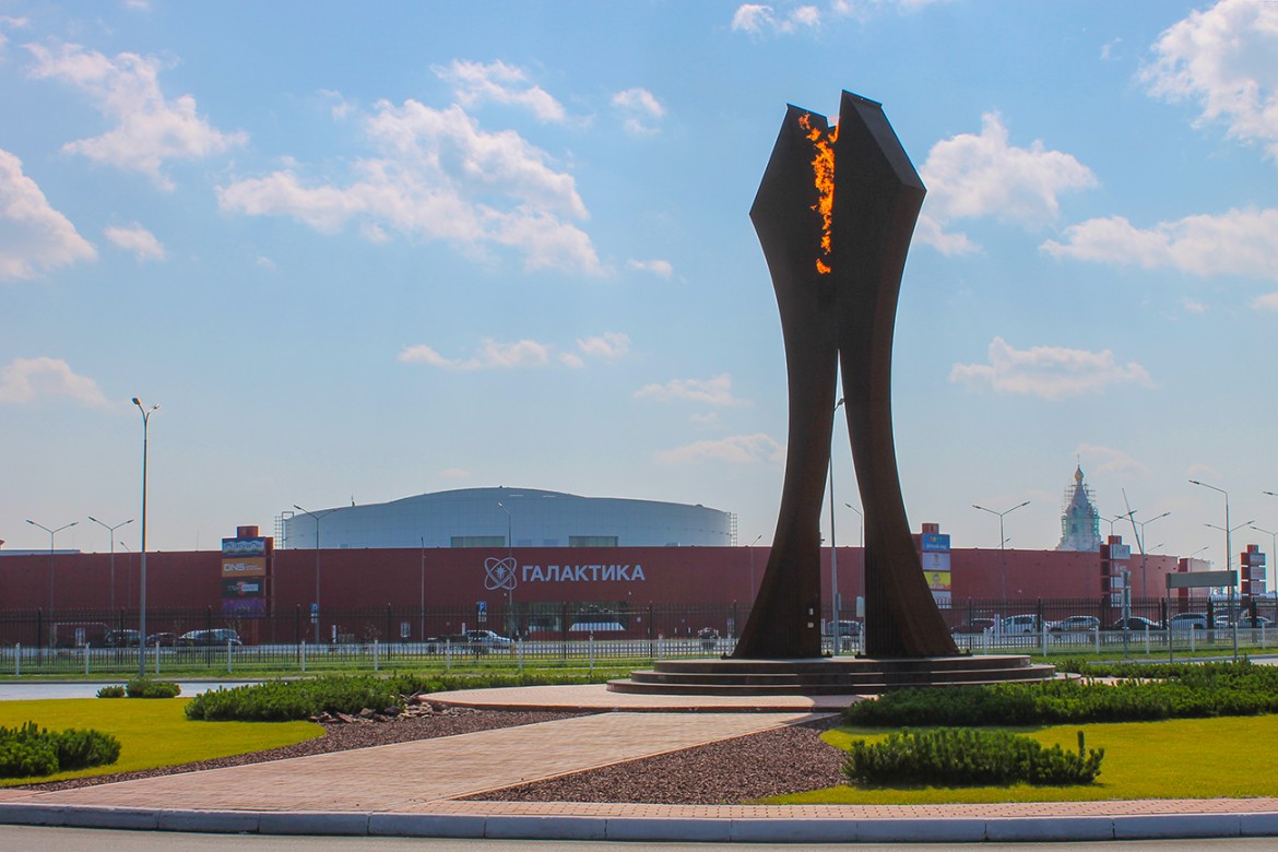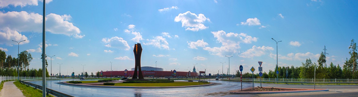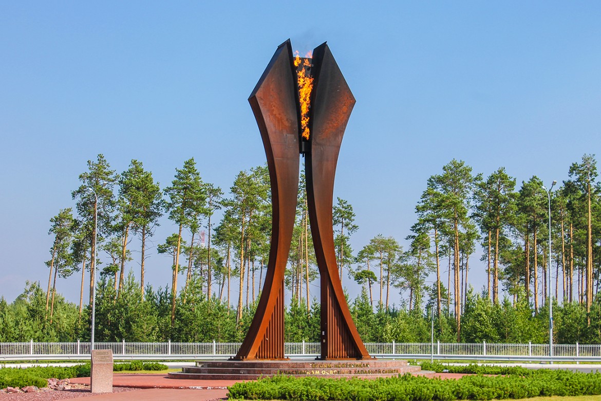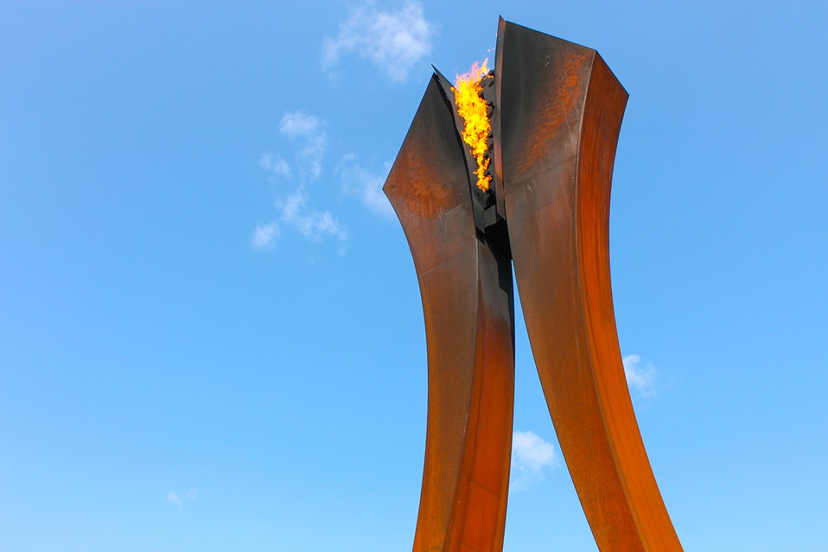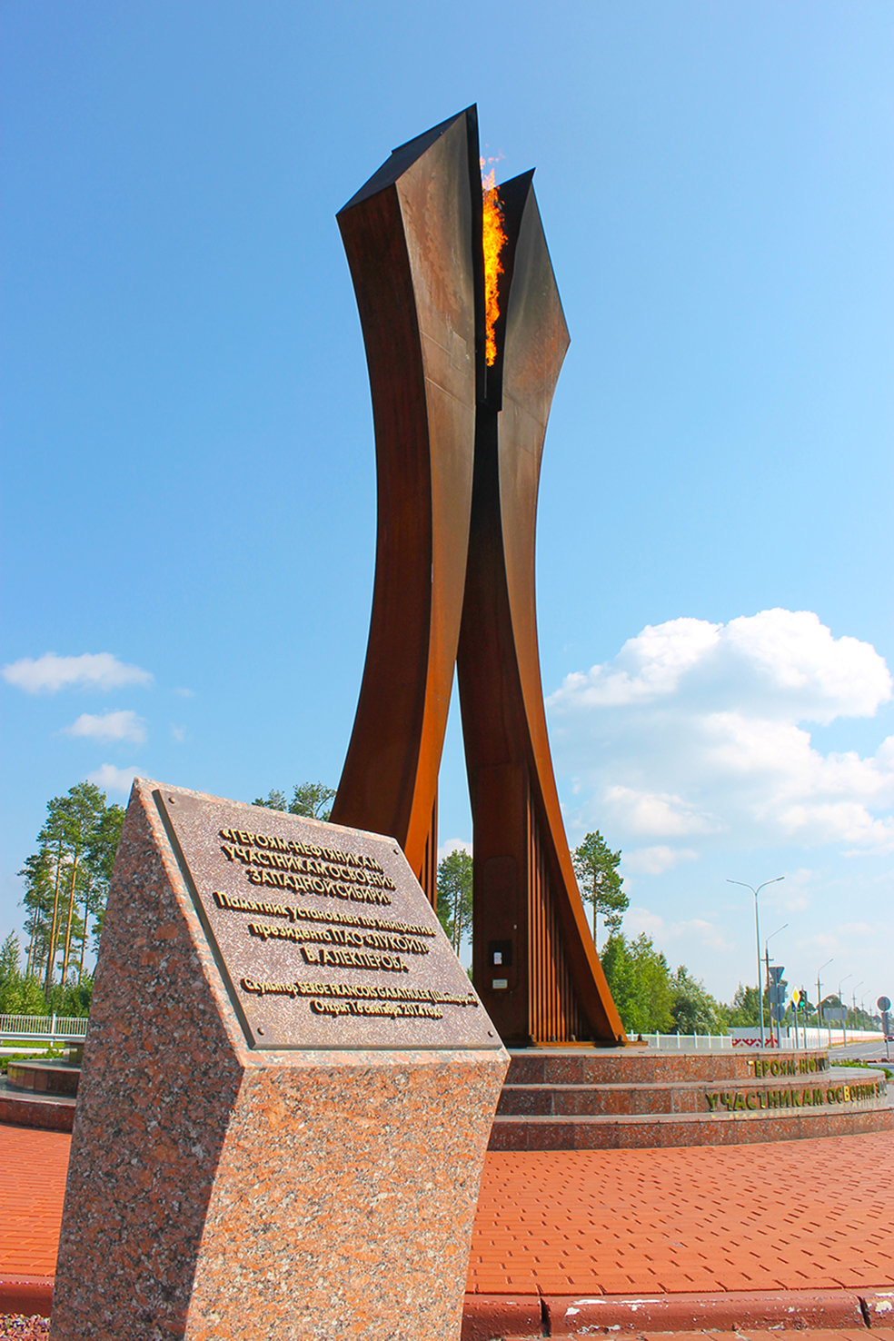 Подарок жителям Когалыма. Памятник выполнен в современном стиле в виде металлической инсталляции - двух стремящихся вверх параллелей, объеденных в центре горящим факелом, олицетворяющим значимость нефтегазовой отрасли для человечества.