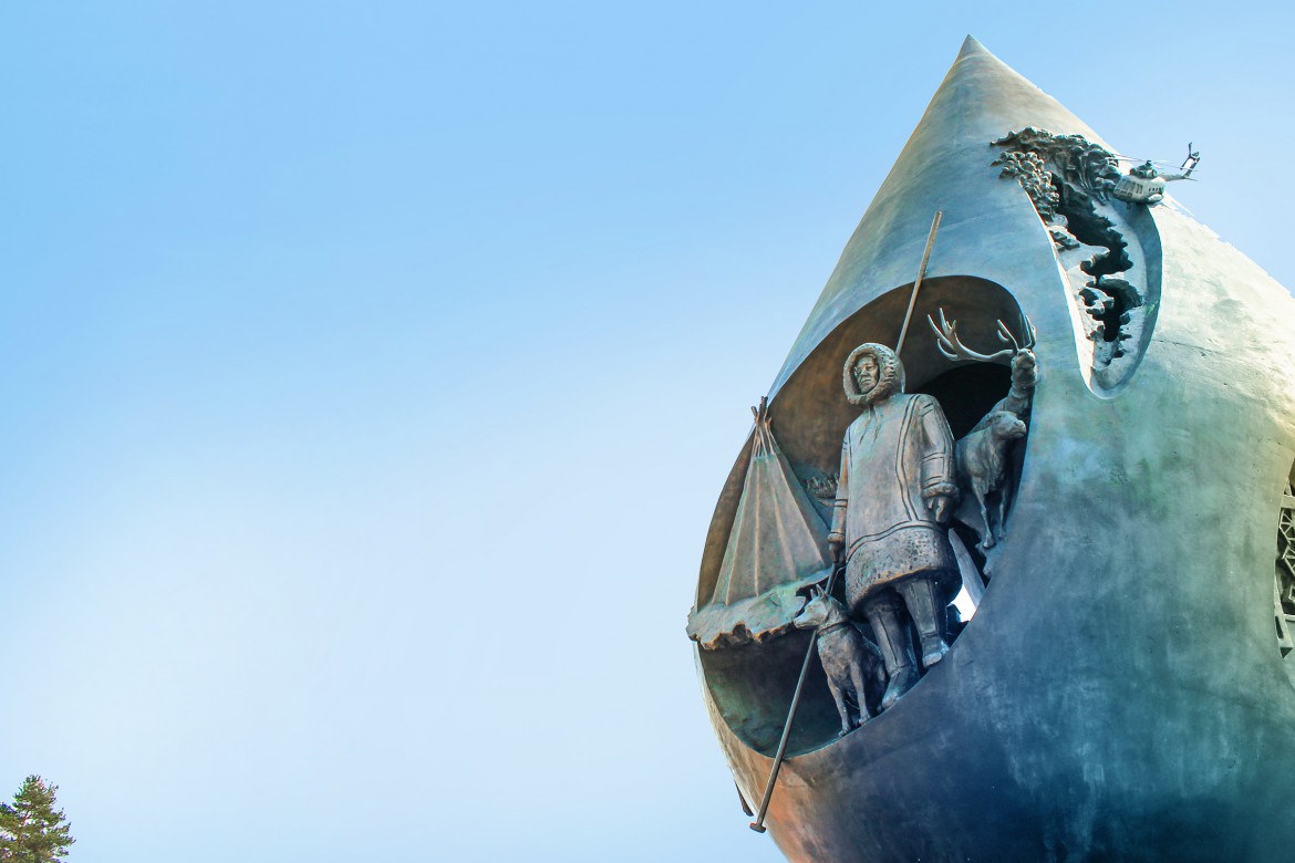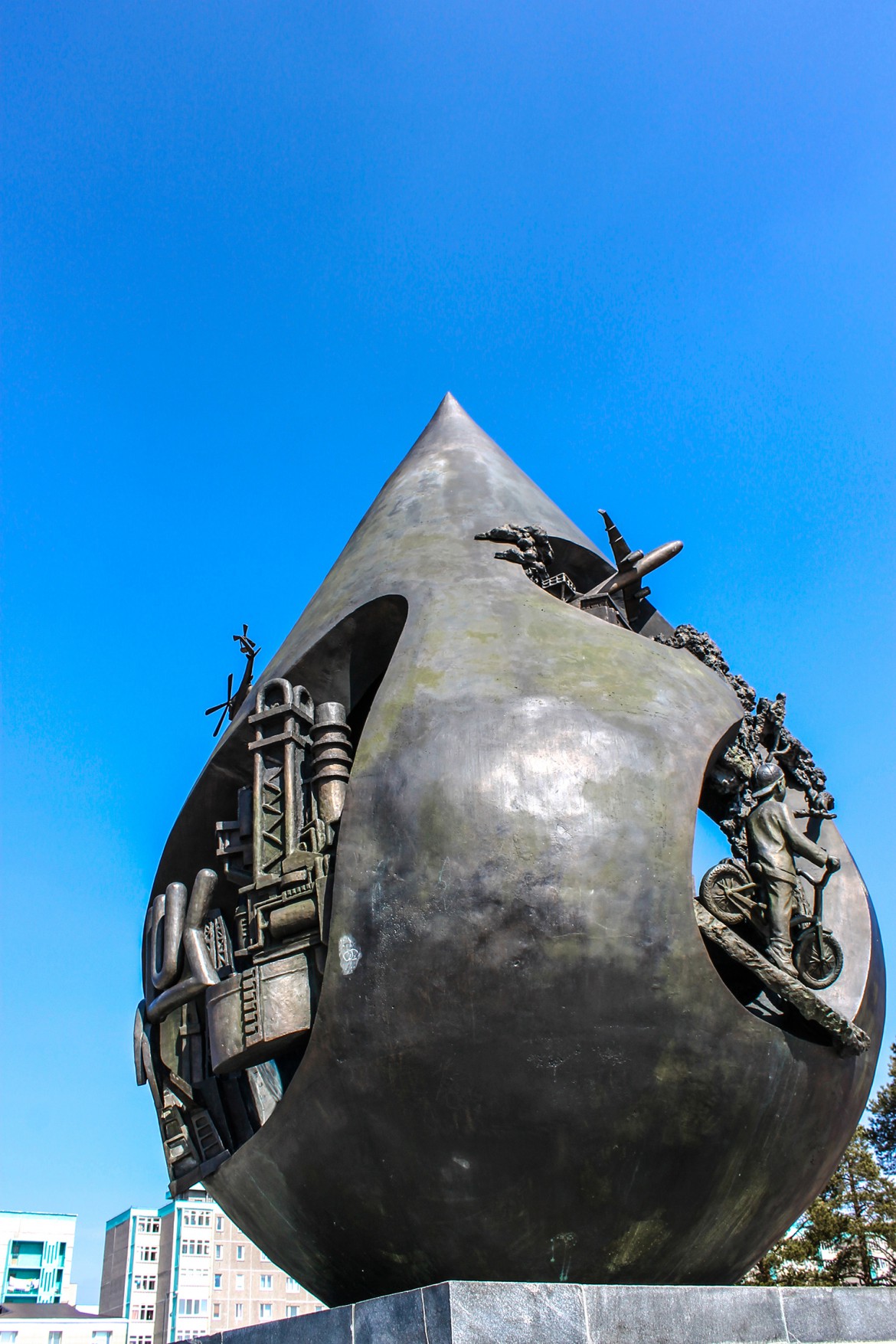 Общая высота скульптурной композиции 8,5 м. На стилизованных гранях нефтяной капли представлены сюжеты из жизни таежного города - молодожены на пороге ЗАГСа, коренное население, северный народ, ханты, счастливые дети, нефтяная промышленность, природа.