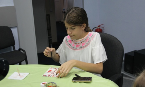 Во время просмотра презентации ребята познакомились с семантикой орнамента в резьбе, росписи и вышивке, после чего все занялись росписью плоскостного изображения лопасти мезенской прялки.